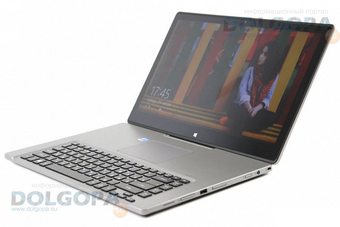 Основные характеристики Acer Aspire R13 следующие: сенсорный 13,3-дюймовый дисплей с разрешением 2560*1440 пикселей и глянцевым покрытием; платформа Intel – процессор Core i7 c частотой каждого ядра 2 ГГц и графический ускоритель Intel HD Graphics 4400HD; оперативной памяти 4 гигабайта, тип памяти DDR3; для постоянного хранения данных используется твердотельный накопитель SSD емкостью 256 гигабайт; на корпусе вы найдете 2 разъема USB 3.0, 1 разъем USB 2.0, аудиовыход и кардридер; беспроводных модулей два – Wi-Fi и Bluetooth 4.0. Работает всё это под управлением операционной системы Windows 8.1. Габариты ноутбука 323*230*18 мм при весе 1,46 кг. Дизайн Acer Aspire R13 – еще одно сильное место данного аппарата после производительного железа. Лэптоп унаследовал от старшего брата Aspire S7 стеклянную крышку из сверхпрочного закаленного стекла Gorilla Glass 3. Это не только сообщает нам о преемственности поколений «от старшего к младшему», но и просто делает внешность ноутбука яркой и самобытной. И хотя многие пользователи больше доверяют металлу или пластику, считая их более надежными и практичными, мы со всей ответственностью заявляем, что закаленное стекло – не менее, а то и более прочный и качественный материал, единственный минус которого – быстрое покрытие отпечатками пальцев. Остальная часть корпуса выполнена из пластика, который делает ноутбук более легким. Сборка качественная – ноутбук не только выглядит дорого, но и ощущается в руках таковым. Окантовка дисплея и петель крепления экрана к клавиатуре выполнена из металла. Это создаёт ощущение еще большей надежности и дороговизны изделия. Суть особого форм-фактора модели Acer Aspire R13 заключается в том, что дисплей крепится в рамке и свободно может вращаться в ней, позволяя пользователю самому выбирать наиболее удобный для него вариант использования экрана. При желании вы можете раскрыть ноутбук практически на 180 градусов. Петли достаточно тугие, что является положительным моментом, вы можете быть уверены, что ноутбук выдержит не один год эксплуатации. Нас порадовало, что в разложенном состоянии дисплей не продавливается вслед за нажатиями пользователя – это говорит о надежности и прочности конструкции. К слову, такой механизм даже имеет свое имя – Ezel. Остальным разработчикам трансформеров стоило бы брать пример с Asus. Нижняя часть ноутбука выполнена из софт-тач пластика. Это недорого, но очень практично и рассчитано на длительный период эксплуатации. Здесь же находятся и динамики, которые расположили возле небольших ножек, и решетка вентиляционной системы. Клавиатура островного типа с классической раскладкой и приятной автоматической подсветкой. Работать за ней приятно и комфортно. К сожалению, отсутствует дополнительный цифровой блок, и клавиши F совмещены с цифровым рядом. Это сделано с целью увеличения компактности устройства. Под клавиатурой расположен удобный и достаточно крупный тачпад. Аккумулятора хватает на 5-6 часов работы Acer Aspire R13 в смешанном режиме нагрузки.